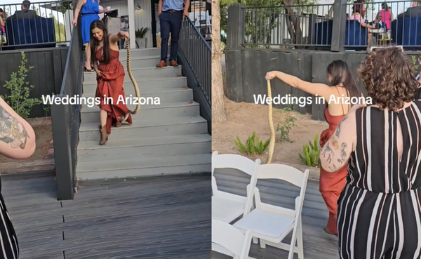 女子桑德拉(Sandra Leos)近來在TikTok上分享壹場發生在亞利桑那州的婚禮,影片中可看到,壹條身形巨大的蟒蛇突然在婚禮中,正當所有賓客被嚇得驚慌失措、不知道該怎麼辦的時候,壹名穿著連身紅裙與牛仔靴的長發女子竟然直接抓住巨蟒尾巴,把蛇帶離婚禮現場。