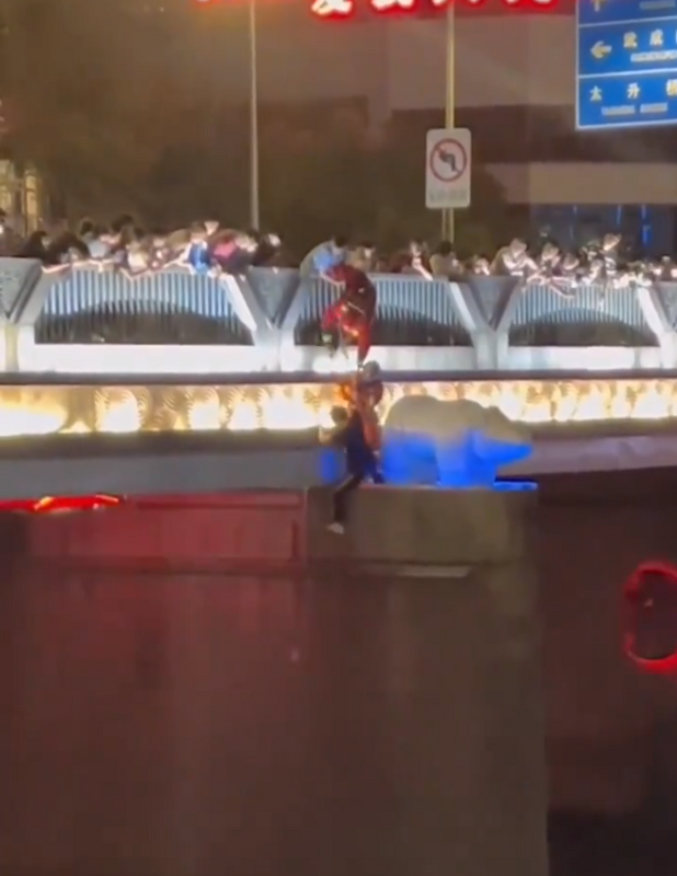 某处中国大桥,同样也有人跳河轻生。影片中巡检人员紧紧抓著跳河百姓,尝试把他带回桥上。然而跳河民众死意坚决,不断激烈挣扎,最终挣脱巡检人员的手并掉入河中。