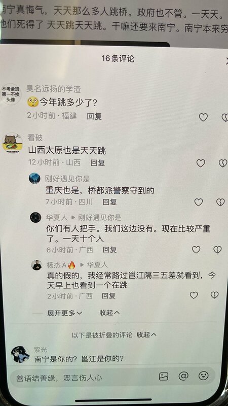 X(前推特)帐号“财经真相”指出,广西南宁邕江大桥也接连发生多起跳河事件。8 日才跳了一个,13 日又有人想不开,14 日,根据一位钓鱼民众所发的抖音,半小时内就跳了 2 个。一些网友也补充说,山西太原与重庆,也有民众跳河。
