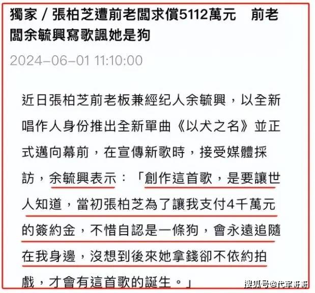 余毓興在其新歌《以犬之名》中直接指出張柏芝在2011年面臨困境時求助於他,並為了4千萬簽約金不惜表示願意像小狗壹樣忠誠於他。