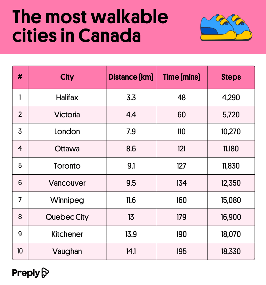 据 Preply 称,这项研究利用 Tripadvisor 和谷歌地图的数据,来确定加拿大 21 个主要城市中每个城市前五大景点之间的步行时间。