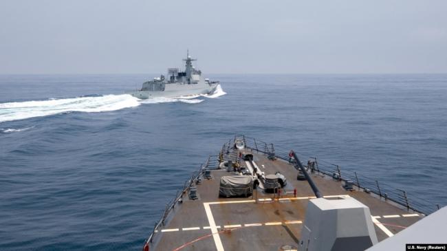 资料照:从美国海军钟云号伯克级导弹驱逐舰的甲板上可以看到中国海军旅洋III号导弹驱逐舰在台湾海峡附近驶过。 (2023年6月3日)