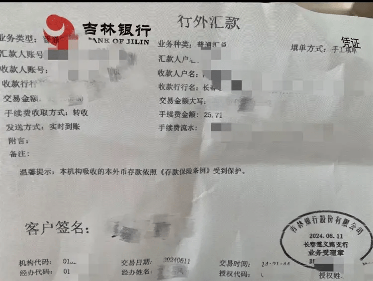 11日下午,極目新聞記者嘗試聯系當事人,截至發稿未獲得相關回復。據該網友在評論區發布的匯款憑證顯示,此事發生在吉林省長春市吉林銀行長春遵義路支行。