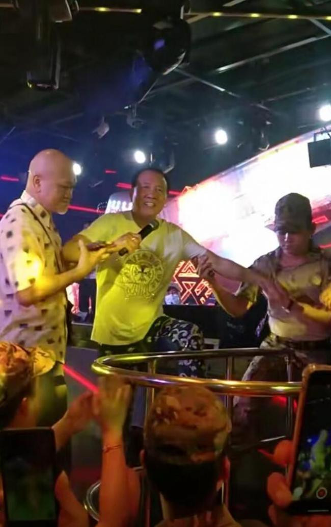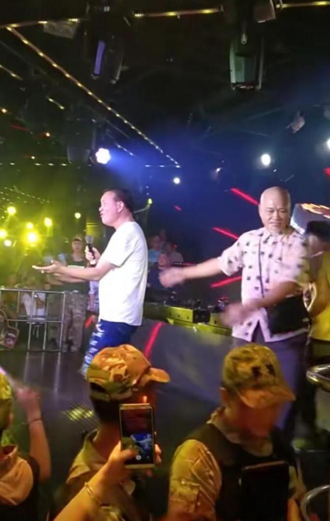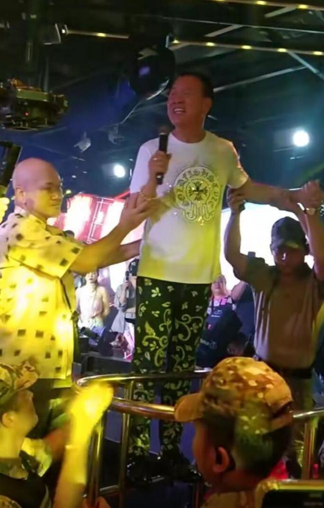 萬梓良好不容易站穩了,還需要叁個人攙扶著。他雖然費力站起來,但唱歌還是拾分賣力,拿著話筒喊得聲嘶力竭,連臉都喊得通紅。這壹身穿搭還有手上的假珠寶,看上去拾分落魄。