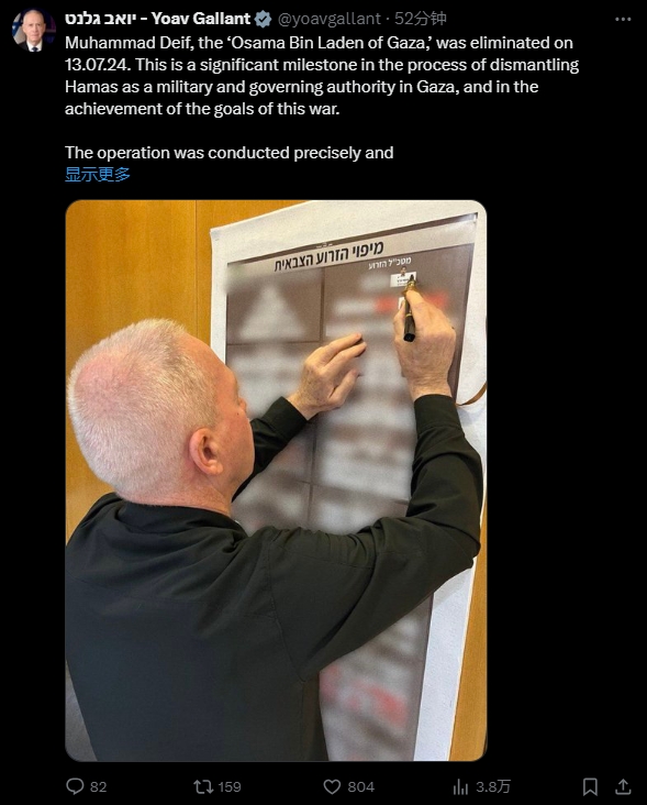 以色列国防部长加兰特1日在社交媒体X平台发布推文,将戴夫称作“加沙的本·拉登”。
