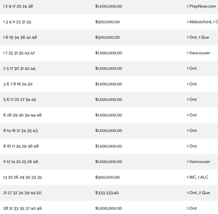 一名来自大温旁边的Abbotsford的玩家和一名安省玩家都中了1 3 4 11 23 31 33这组号码,两人都分得50万加元。