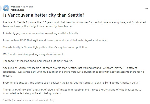 西雅图人也一样,这次,西雅图 Reddit 子版块中提出的一个”温哥华是否比西雅图更好?“的问题,对话涵盖了住房、食品成本以及人们有多酷(或不酷)等话题。