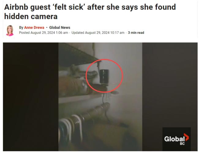 加拿大BC省的一名女子爆料称,她通过短租平台Airbnb预订的公寓内发现了隐藏摄像头,她称自己再也不会使用Airbnb了。
