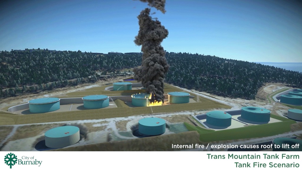 据周四发布的本拿比市政府新闻稿称,这些电脑动画是在 2021 年聘请工程公司 ONEC 进行风险评估后制作的,其中包括对横山管道两处设施潜在“重大事件”的描述。