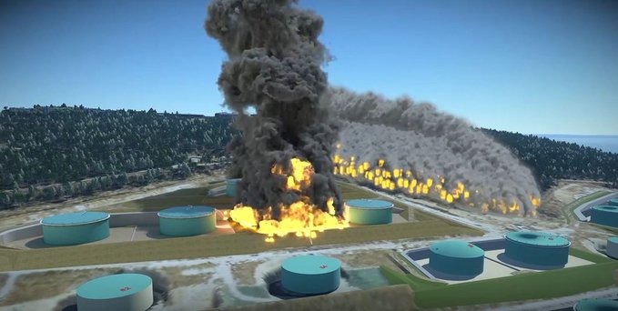 该新闻稿称,动画显示油罐屋顶下方起火,导致焊缝移位并炸毁屋顶。油罐表面的火灾随后变成全表面罐火灾,可能会升级为沸火。