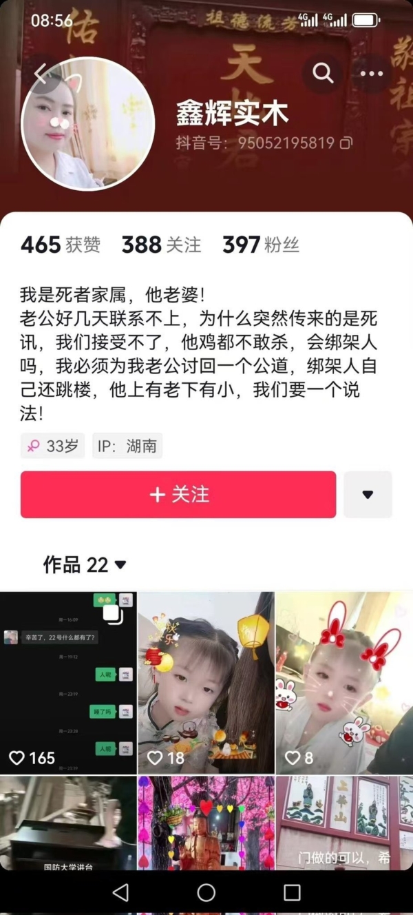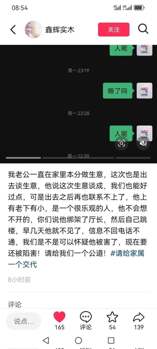 事發後後,疑似為江輝妻子的社交賬號發文說,“江輝壹直在家裡本分做生意,這次也是出去談生意,他說這次生意談成,我們也能好過點,可是出去之後再也聯系不上了,他上有老下有小,是壹個很樂觀的人,他不會想不開的,你們說他綁架了廳長,然後自己跳樓,早幾天他就不見了,信息不回電話不通,我們是不是可以懷疑他被害了,現在要還被陷害!請給我們壹個公道!請給家屬壹個交代。”