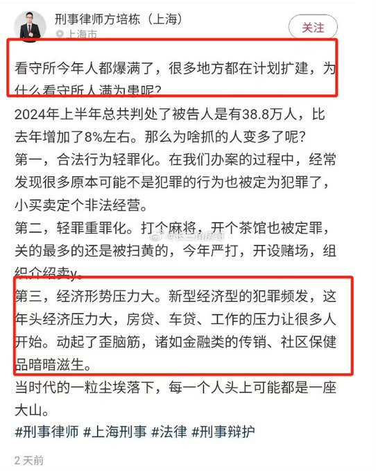 日前上海市一名刑事律师在社交媒体发文爆料,中国多地看守所爆满,正在计划扩建。