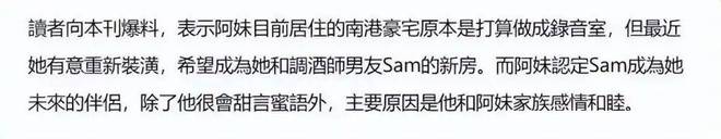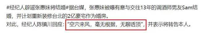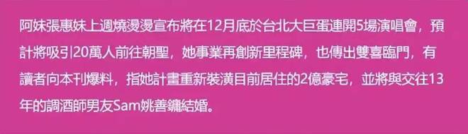 近日,有关张惠妹即将结婚的传闻再度被提起,令不少粉丝为之兴奋不已。据悉,这一次的传闻源自于媒体的报道,称张惠妹与男友Sam的感情一直十分稳定,而两人的婚姻大事也即将有了新的进展。据悉,张惠妹的经纪人陈镇川对于这样的传闻进行了回应,直言这样的消息“毫无根据,无聊透顶”,并且还特意强调称“她没有这个打算”。