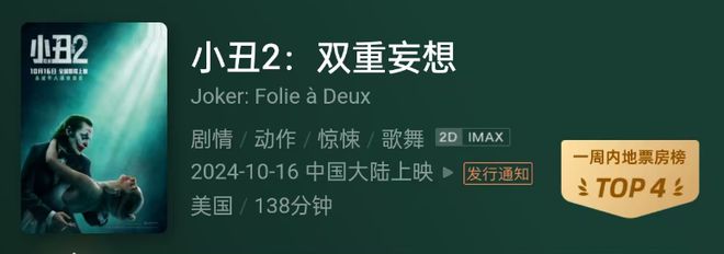 后重新点映了一波《哈利波特与密室》试图挽回一下颜面。好不容易来到10月,上映了大制作的精彩大片《小丑2:双重妄想》,不出意外地……再度扑街。