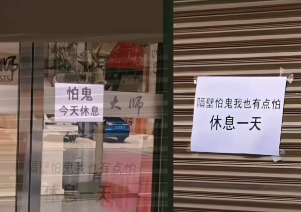 广东许多商家贴出五花八门的借口关闭,如“怕鬼”、 “夫妻吵架”、“老板心情不好”。