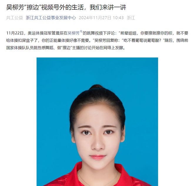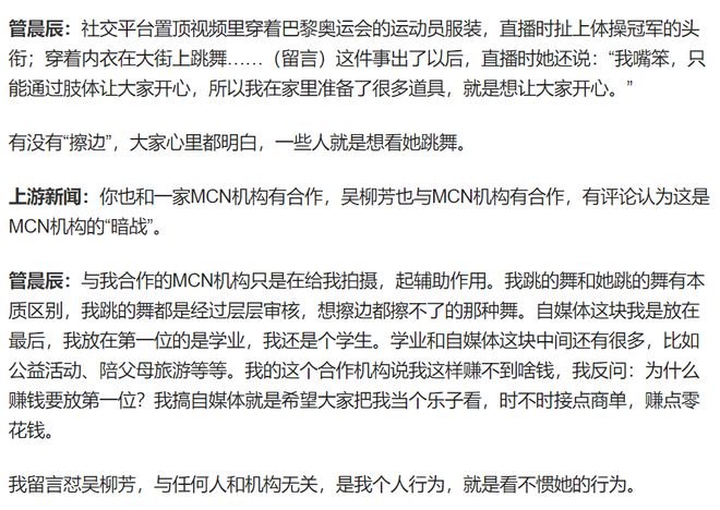 這些天,關於吳柳芳和管晨辰的“沖突”引發了不少網友的熱議,而且議論聲此起彼伏,壹輪超過壹輪。壹開始,管晨辰說吳柳芳發的視頻在給體操扣屎盆子,讓她不要這麼做了。但是,吳柳芳不為所動,繼續發類似之前的視頻。後來,管晨辰又在接受采訪的時候表示,自己就是單純看不慣吳柳芳的行為,她發布的那些擦邊視頻會帶來不好的影響。