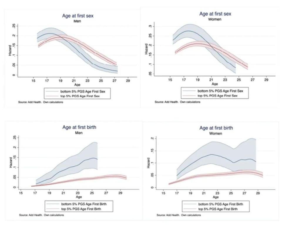 图注:上:男性和女性首次性行为事件在各年龄发生的概率,下:男性和女性首次生育事件在各年龄发生的概率。蓝色代表PGSs最末尾5%的人,红色(愿称之为单身狗曲线)代表PGSs评分最顶端5%的人