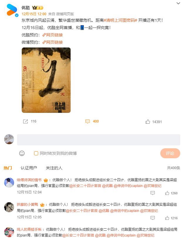 在優酷替《清明上河圖密碼》宣傳的微博下邊,清壹色都是成毅粉絲的維權內容,而且從評論的內容來看,這是有組織在背後操作的。主要就是說《長安贰拾肆計》的,具體內容我們就不分析了,但成毅粉絲的這個行為,的確是給《清明上河圖密碼》造成了不小的困擾。