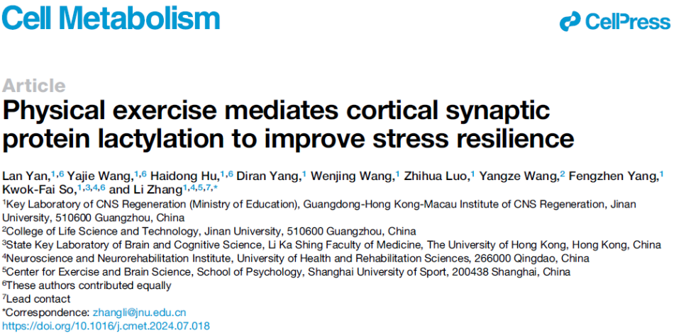 我們在運動的過程中會產生關鍵的代謝物——乳酸。2024 年 8 月,暨南大學粵港澳中樞神經再生研究院張力團隊在《細胞》雜志子刊《細胞代謝》上發表的壹項研究發現:運動後產生乳酸,使得血液和大腦中的乳酸水平顯著升高,此時乳酸分子會促進大腦皮層中特定突觸蛋白的乳酰化,從而有效緩解由壓力引起的焦慮。