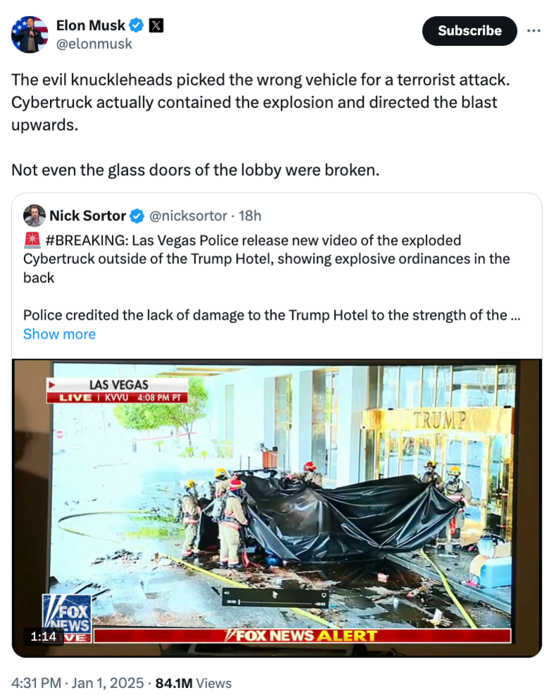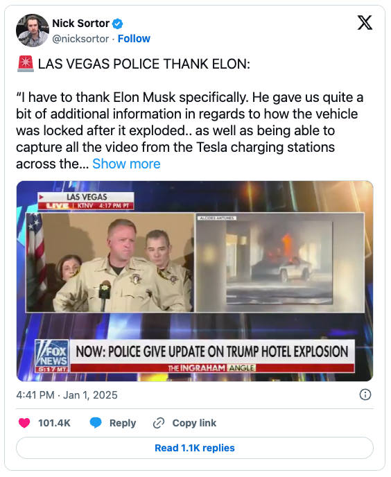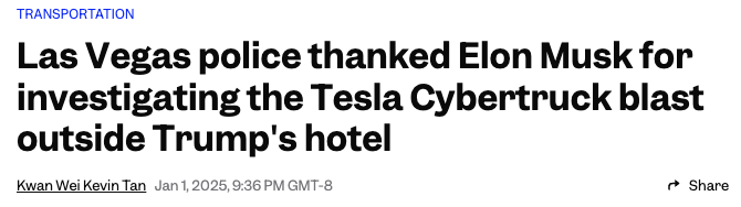 一辆Cybertruck在川普酒店外爆炸拉斯维加斯警方对特斯拉首席执行官马斯克(Elon Musk)协助此案调查表示感谢。