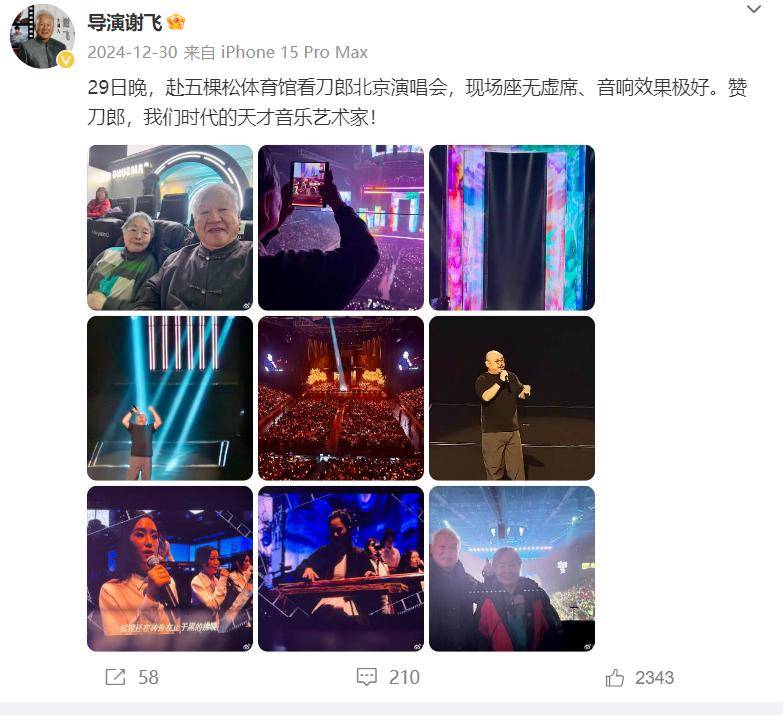 12月30日,謝飛發微博稱贊刀郎。他這樣寫道:29日晚,赴伍棵松體育館看刀郎的北京演唱會,現場座無虛席,音響效果極好。贊刀郎,我們時代的天才音樂藝術家。