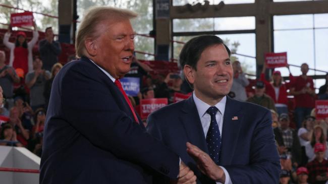 未來的美國國務卿魯比奧如何同中國接觸備受關注。圖為川普與魯比奧(Marco Rubio)出席在北卡羅來納州舉行的競選活動時握手。(Reuters)