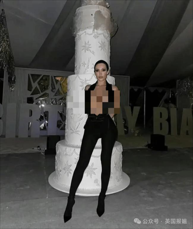 派对当天,比安卡的着装再次吸引了所有人的目光。她穿着一条极为性感的黑色礼服,上半身只用两根竖带遮掩,可以说几乎没有任何遮挡。