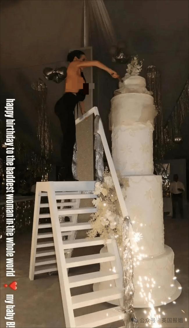 派对上的生日蛋糕也是一大亮点,生日蛋糕有两个比安卡高,需要站在梯子上才能切开……