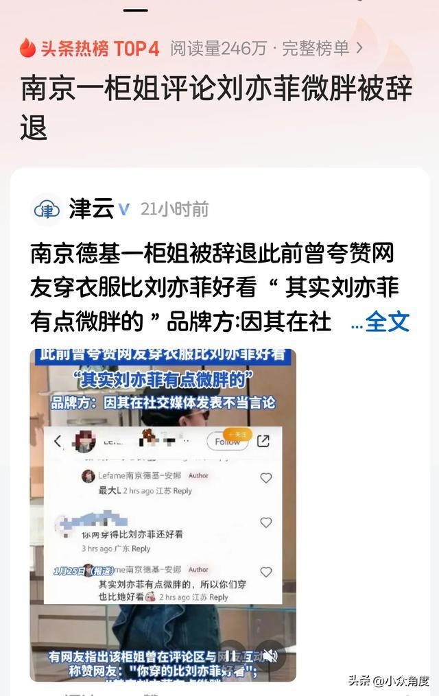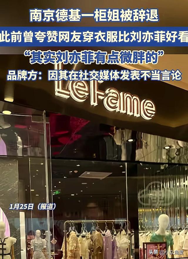 近日,南京壹櫃姐因嘲笑劉亦菲微胖被公司辭退,引發網友熱議。很多不明真相的網友對於這個處罰,覺得莫名其妙,只是評價劉亦菲微胖,也不算什麼過激言論,為什麼要辭退櫃姐,這個處罰是否有些太過呢?