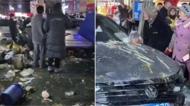 現場視頻顯示,路邊壹連多家露天小吃攤被撞翻,滿地食物和杯子、紙盒等雜物,還有垃圾桶被撞翻。現場有男子焦急地喊“快打120”。