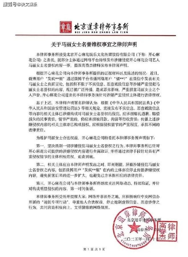 在这场舆论风暴中,马丽与赵丽颖本人并未直接回应。然而,随着事态的进一步发展,马丽的律师团队终于坐不住了。北京道章律师事务所就马丽名誉维权事宜发表声明,称近期有微博用户通过平台传播有关马丽的不实信息和恶意诋毁言论,已造成严重恶劣影响,损害马丽个人声誉。律所已针对涉嫌侵权内容进行全面取证,并将通过法律手段积极维权。