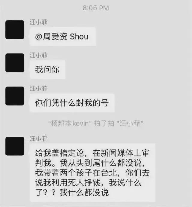 而在發朋友圈之前的晚上8時許,汪小菲就在壹個名為“華人之光”的微信群裡,質問TikTok的CEO周受資——“你們憑什麼封我的號”?他還說,“我從頭到尾什麼都沒說,我帶著兩個孩子在台北,你們卻說我利用死人掙錢,我說什麼了?”