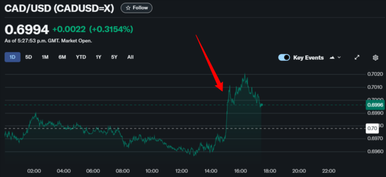 在墨西哥商品獲得壹個月豁免的消息傳出後,加元對美元的匯率出現了瞬間飆漲。