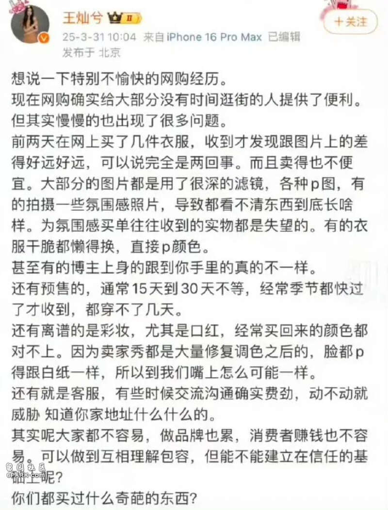 王燦還表示,“有些時候和客服交流溝通確實費勁,動不動就威脅‘知道你家地址’什麼什麼的。其實呢大家都不容易,做品牌也累,消費者賺錢也不容易。可以做到互相理解包容,但能不能建立在信任的基礎上呢?”