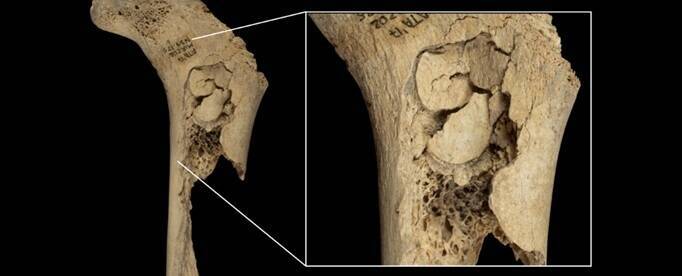 婴儿股骨上的压碎痕迹,显示疑似进行取骨髓行为。(图:IPHES-CERCA)