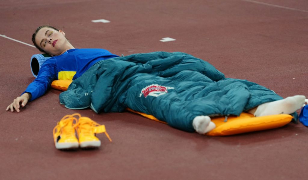 來自烏克蘭,曾在巴黎奧運奪金“跳高女神”馬胡奇克(Yaroslava Mahuchikh)近日參與在東京舉行的田徑世錦賽,再次施展她在巴黎奪金秘技,就是帶備睡袋在每次起跳中間眠壹眠,而她的睡容被大量鏡頭捕捉,被日本媒體譽為“睡美人”。
