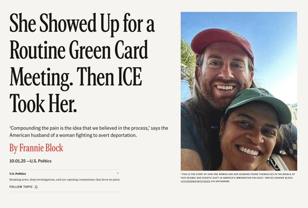 美国公民及移民(专题)服务局(USCIS)近日在洛杉矶(专题)市中心联邦大楼将前来进行绿卡面试的巴西女子芭芭拉·马奎斯(Barbara Marques)拘捕,引发其新婚丈夫塔克·梅(Tucker May)的强烈指责。芭芭拉七年前来到美国,她在约会软件上认识了塔克。两人因对电影的共同热爱而结缘,并于今年四月结婚。
