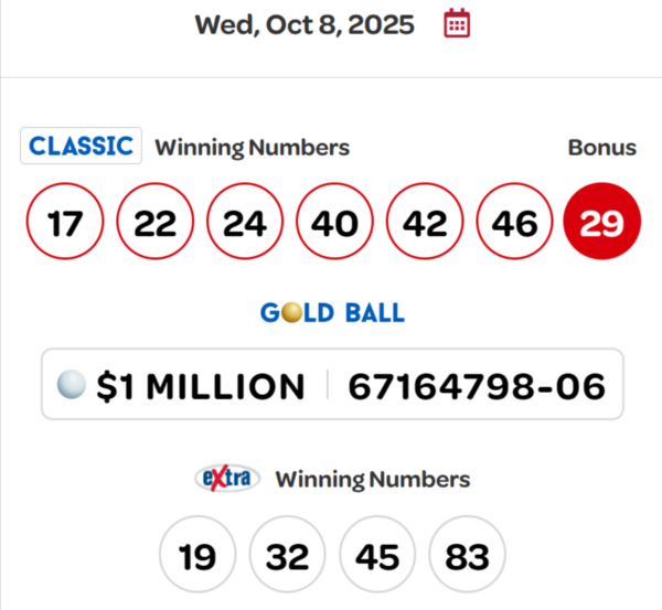 不过有人购买了一张与中奖号码67164798-06匹配的彩票,赢得了价值100万加元的白球奖。据PlayNow报道,这张彩票在魁北克售出。