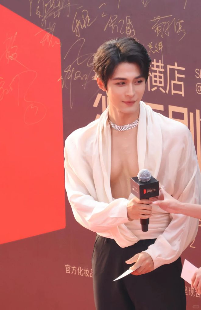 當他和同場女演員壹同亮相時,那件敞開的深V上衣和若隱若現的胸部,讓網友不禁調侃:“還以為他倆在直播打PK呢!”