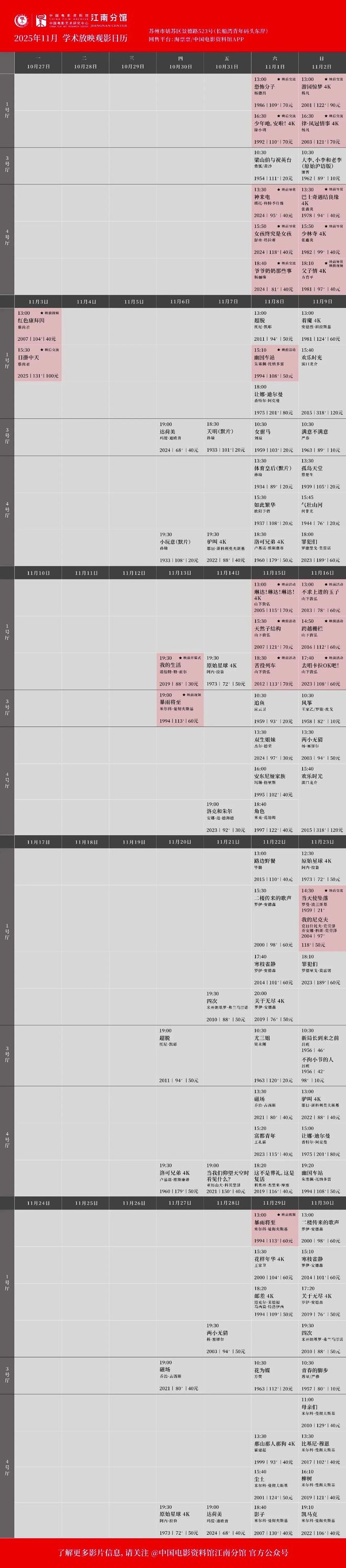 本月江南分馆2025荷兰电影展、山下敦弘专题、罗伊·安德森专题、曼彻夫斯基专题均将靓丽展开。所有场次均可在淘票票、中国电影资料馆APP购票,具体排片见末图,祝大家观影愉快。??