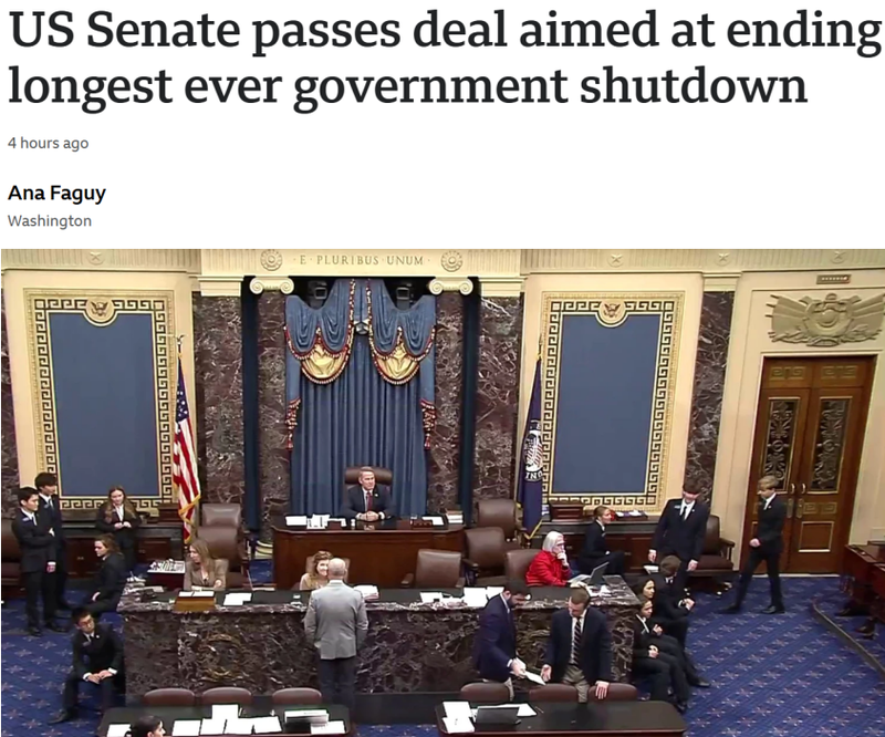 11月9日,在美国政府此次“停摆”的第40天,参议院进行投票达成一项关于结束政府“停摆”的协议,将为政府提供资金直至明年1月30日。