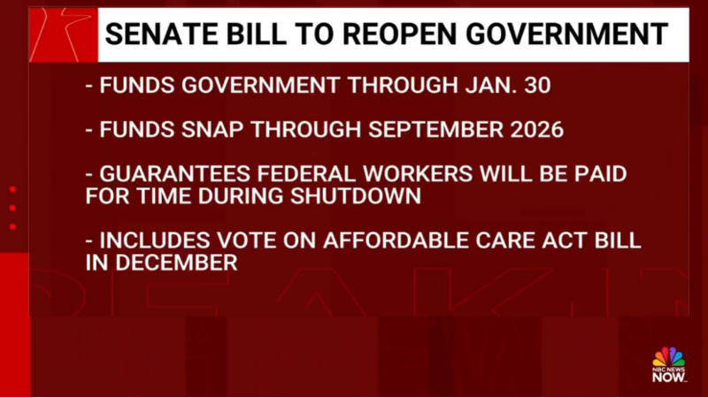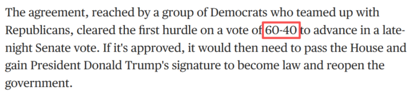当晚,参议院以60票对40票的投票结果,达成了一项关于结束政府“停摆”的协议。