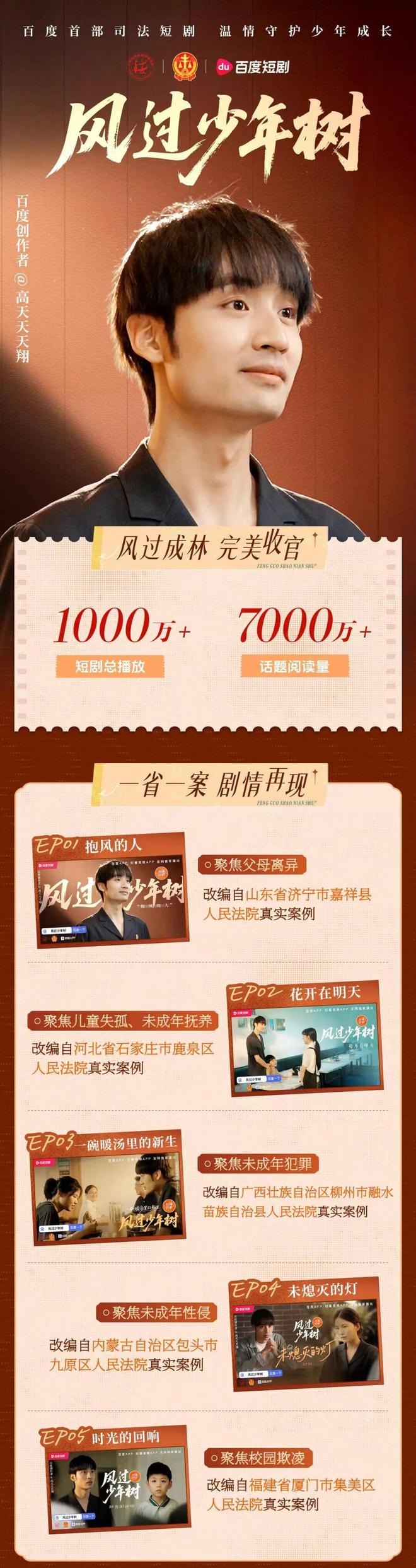 由人民法院新闻传媒总社联合最高法民一庭、百度出品的“守护少年的微笑”系列短剧《风过少年树》(入选序号139)成功入选网络公益短片类优秀作品名单。该剧作为一部社会公益司法短剧,以“温情守护少年成长”为核心,采用“一省一案”模式,改编自山东、河北、广西、内蒙古等多地法院真实未成年人保护案例,聚焦父母离异、未成年人犯罪、学生欺凌等社会痛点话题,生动展现了司法力量对少年成长的守护。