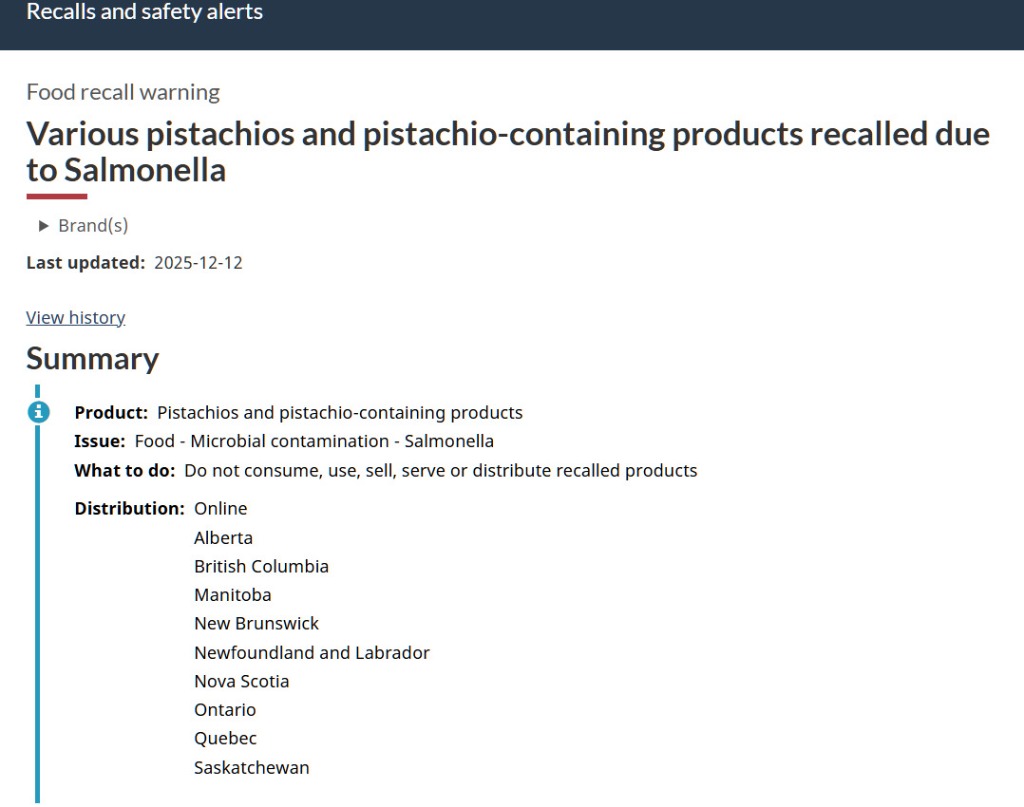 该通知称,与开心果和含开心果产品相关的召回警告最初于去年 7 月发布,随着加拿大食品检验局 (CFIA)食品安全调查的进展,召回警告也定期更新,纳入更多产品。