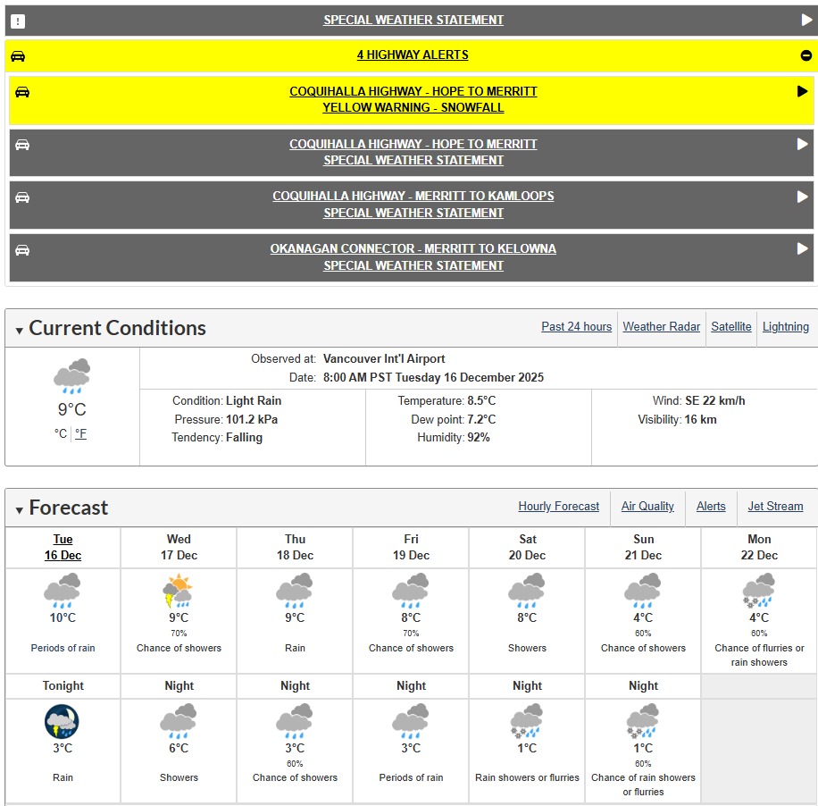 加拿大环境与气候变化部还发布了特别天气声明, 预计一股强劲的冷锋将于今晚横扫低陆平原,今晚午夜前后,大温和菲沙河谷地区将出现强劲的西南风阵风。