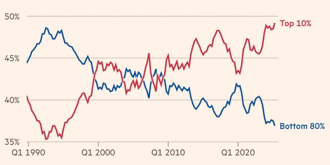 ▲美国前10%富人(红线)的消费力与后80%的穷人拉开差距