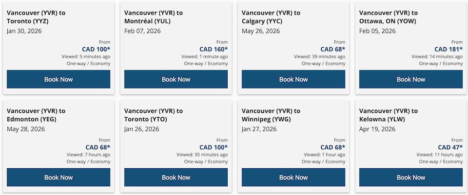 一些低价机票包括从温哥华飞往多伦多(100 元)、温尼伯(68 元)、基洛纳(47 元)和埃德蒙顿(68 元)。