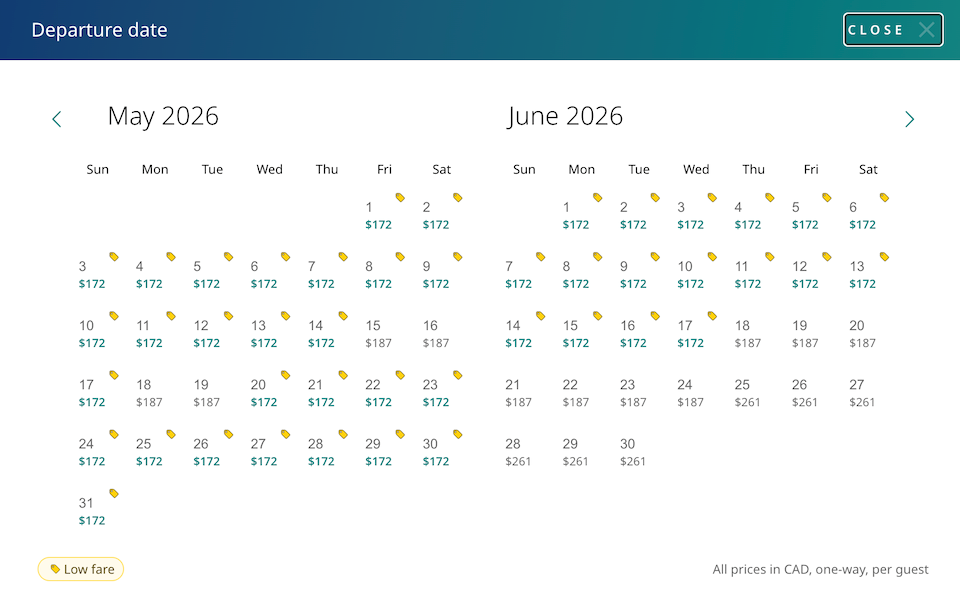 西捷航空的价格日历显示,目前机票价格在六月第三周仍保持低位,而六月第三周通常被认为是夏季旅行高峰期的开始。