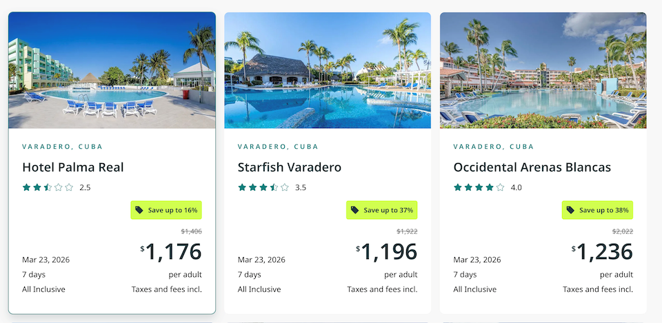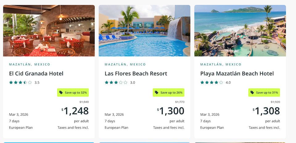 从温哥华出发的旅客预订前往墨西哥马萨特兰(Mazatlán, Mexico) 的旅游套餐可享受超过30%的折扣,而前往古巴巴拉德罗(Varadero, Cuba) 的旅客则可享受高达38%的折扣,其他从温哥华出发可享受折扣的城市包括哥斯达黎加、拉斯维加斯与墨西哥的巴亚尔塔港,但都至少需要预订七晚才能享受折扣。