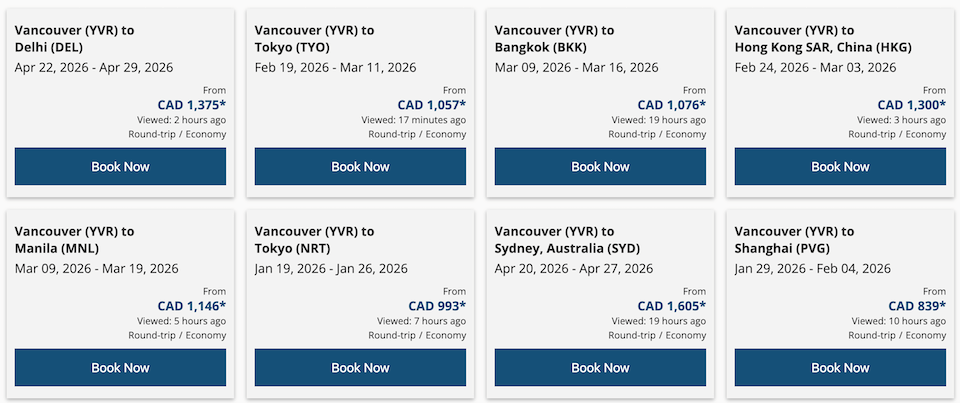 温哥华还有许多前往亚洲和南太平洋的机票优惠,包括新德里(1375 元)、东京(993 元)、上海(839 元)、新加坡(861 元)和台北(1115 元)。